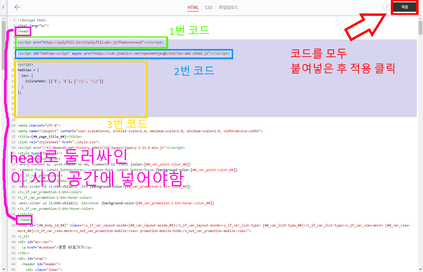 사진 밑의 1번, 2번, 3번 코드를 순서대로 복사해서 <head>와 </head>가 있는 공간 사이에 붙여넣는다.